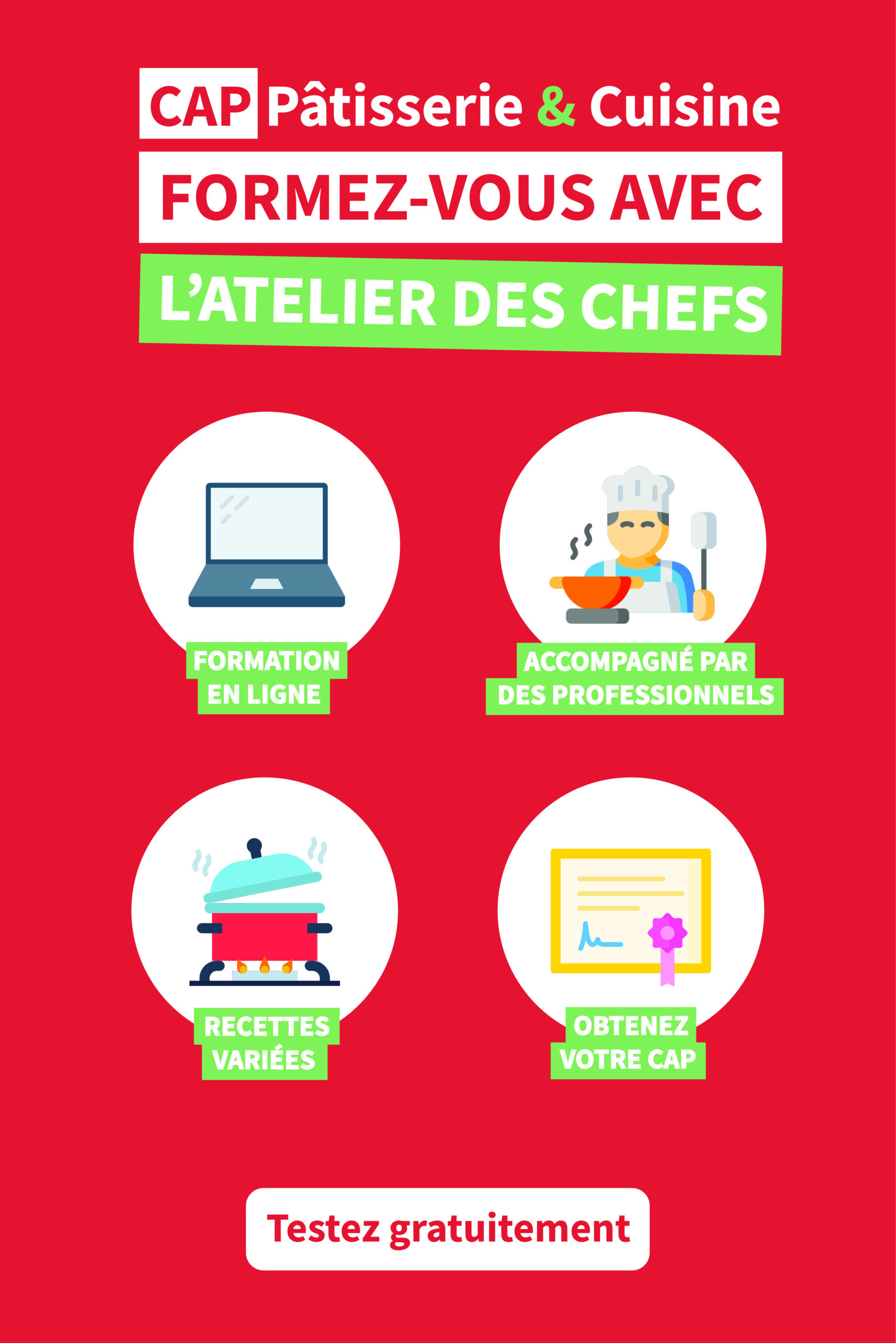 Le Covid à malheureusement pas mal impacté tous ces ateliers. Cependant, l’Atelier des Chefs propose également des formations en ligne pour se former aux métiers de la cuisine. Depuis peu, ils se sont diversifiés en proposant d’autre type de CAP tel que les métiers de la coiffure, de l’ésthétique, petite enfance et tant d’autre.